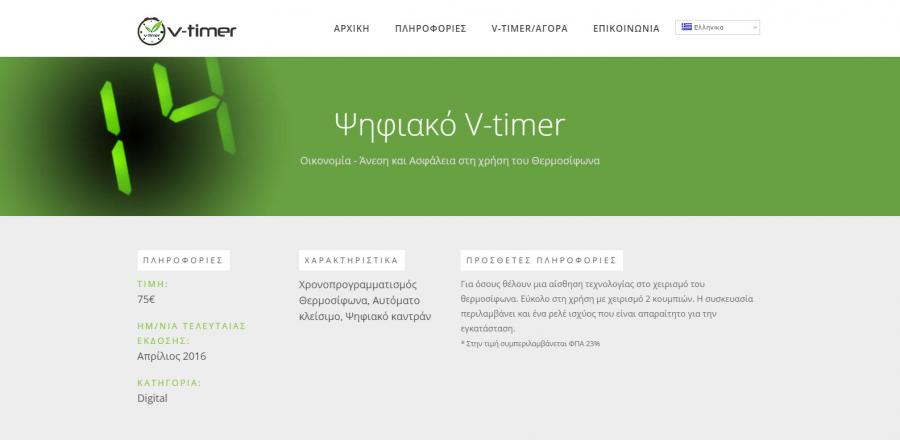 Μέσα από την ιστοσελίδα μπορεί ο επισκέπτης να γνωρίσει τα ωφέλη από τη χρήση του v-timer, τον τρόπο λειτουργίας και τον τρόπο εγκατάστασης. Μπορεί επίσης να κάνει και αγορές.